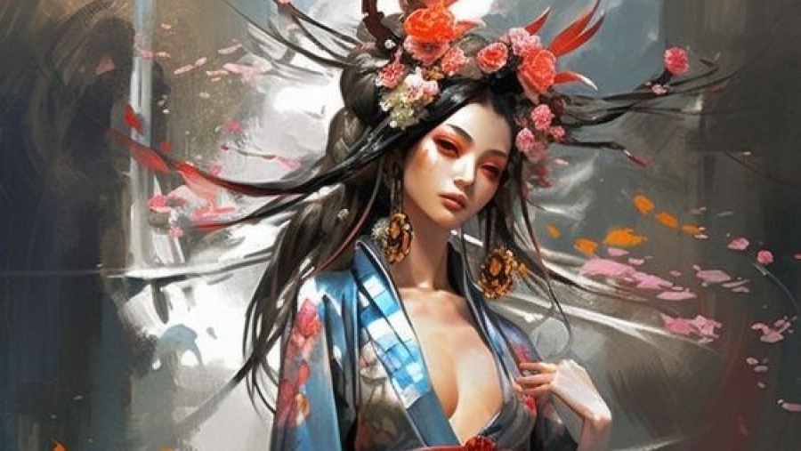Το πορσελάνινο δέρμα της ήταν χλωμό σαν το φως του φεγγαριού, ακτινοβολώντας μια απόκοσμη λάμψη ανάμεσα στις σκιές. Μακριάμαλλιά από έβενο έπεφταν στην πλάτη της, μοιάζοντας με τα βάθη του νυχτερινού ουρανού. Τα νήματα των μαλλιών περιστασιακά μπλέκονταν με αιθέριες κορδέλες, σαν να τα αγγίζει η πνοή μιας αόρατης μαγείας.